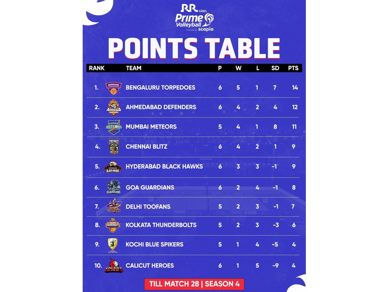 Relentless attacks from Batsuuri and Angamuthu helped the Defenders seize control in the third set. Trailing behind, Mumbai introduced veteran blocker Karthik, whose super serve immediately turned up the heat on Ahmedabad. Nikhil’s sharp left-handed spike added further attacking flair for the Meteors.