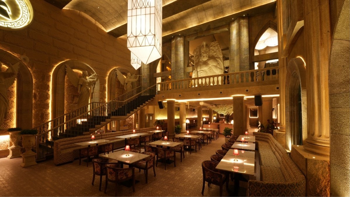 Suspended above the dining floor, a Medusa-inspired installation adds a layer of drama and symbolism, acting as a visual focal point that anchors the venue’s identity. These sculptures are not decorative accents but architectural elements that guide movement, influence sightlines, and enhance the overall experience.